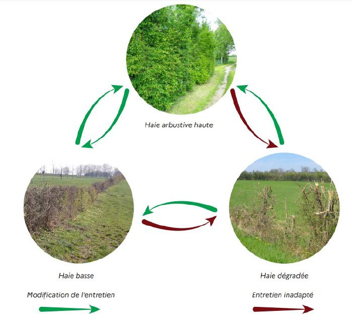 À titre d’exemple, une haie basse qui ne serait plus entretenue évoluerait vers une haie arbustive haute au bout de quelques années.